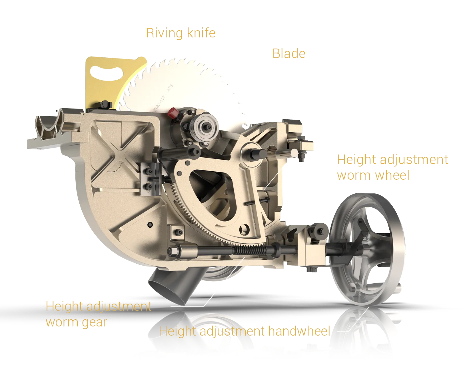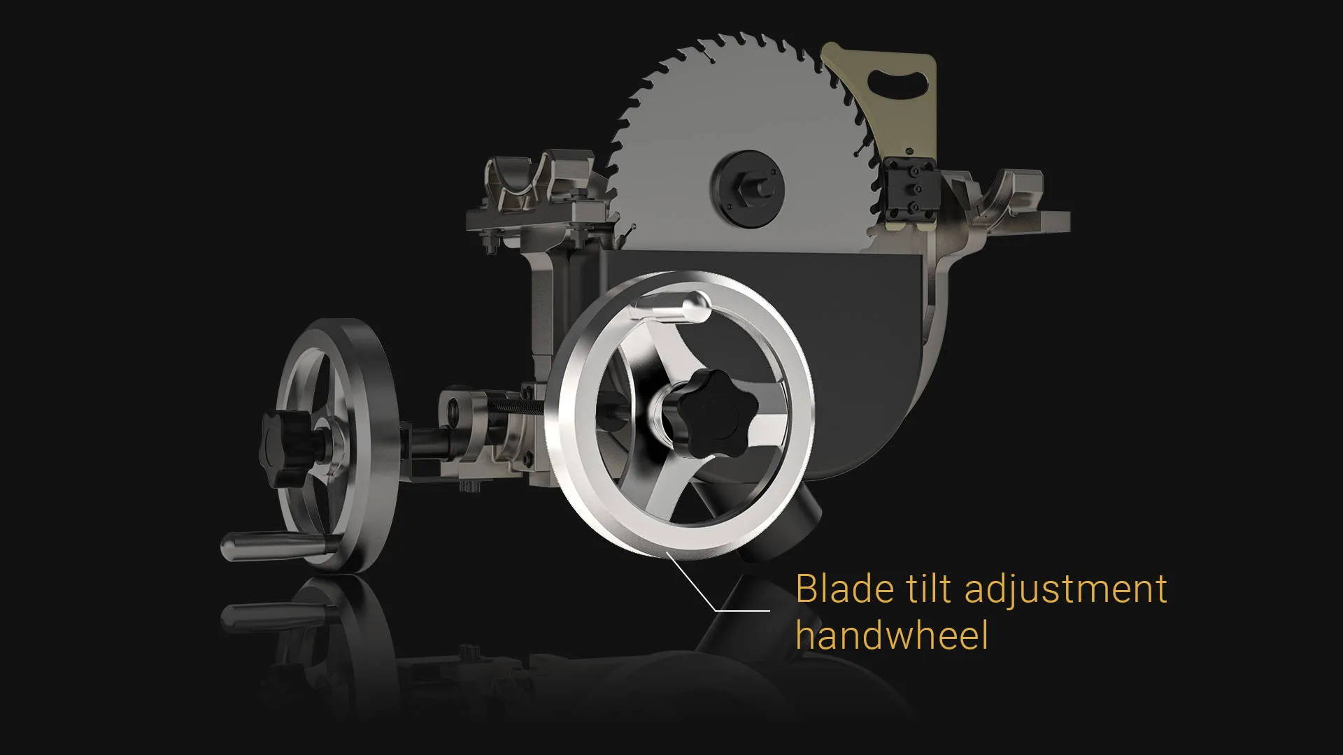 The blade elevating and tilting are both controlled by the worm gear trunnion system. The blade is elevated and tilted by swing the worm wheel.