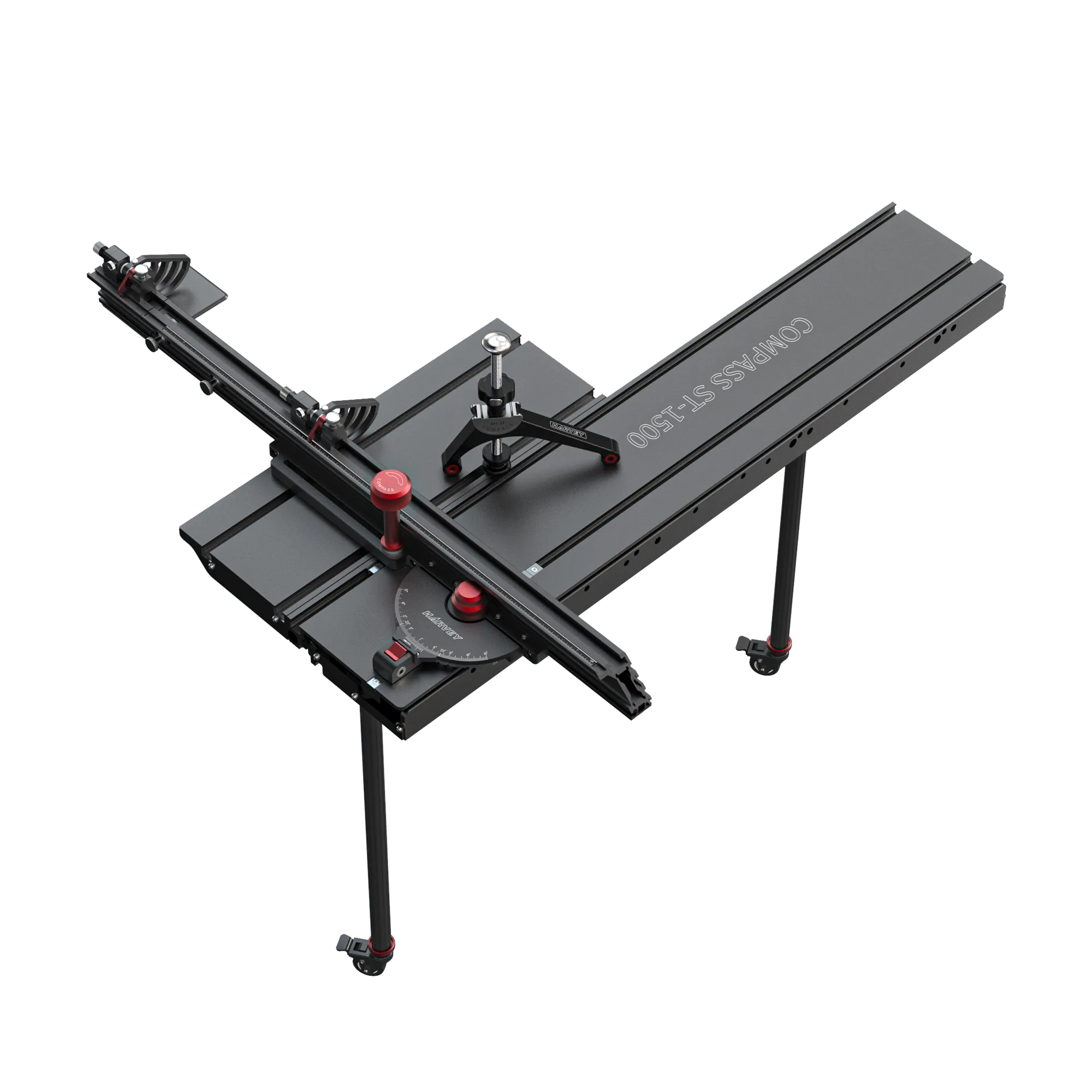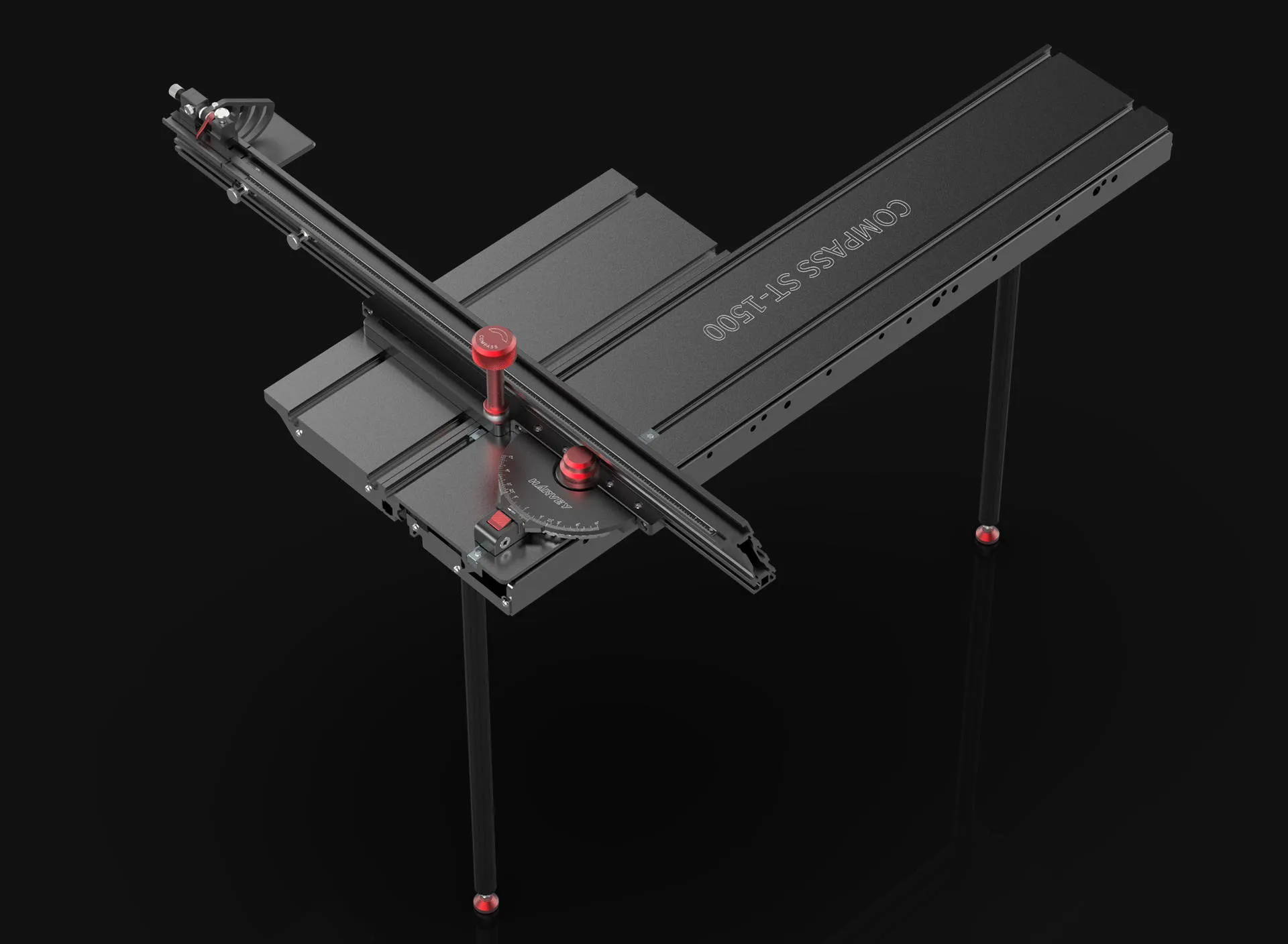 The COMPASS MG-36Pro is a precision miter gauge made of T-6 aircraft-grade aluminum alloy with 0.1-degree angle setting accuracy. It features quick-action positive angle settings for ±60°, ±45°, ±30°, ±22.5°, ±15°, and 0° with single-handed operation. Includes a 36" crosscut fence with accurate flip stop and locking knob.