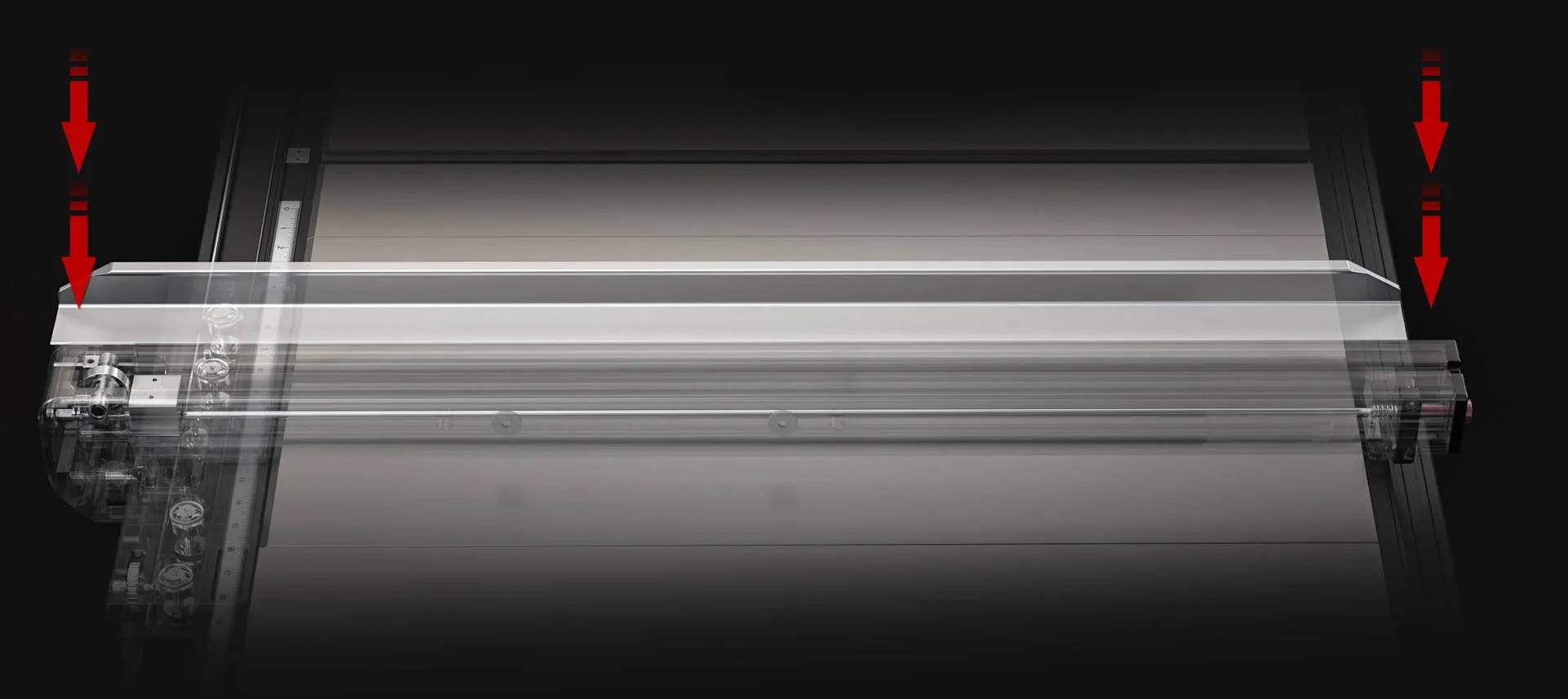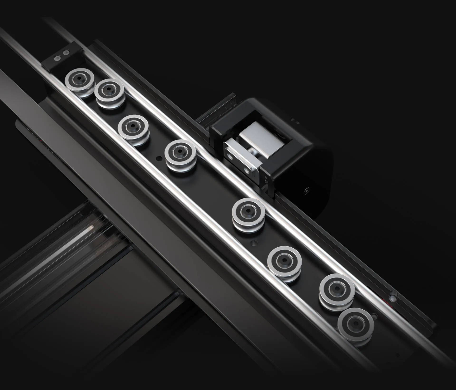 At the core of the Big Eye Rip Fence System lies the Dual-axis Linear Guide Rail System, featuring eight rollers with bearings that effortlessly glide along the two hardened and ground steel rods with zero clearance. This innovative design replaces traditional bushing sliding friction with smooth rolling friction, resulting in exceptional accurate fence movement (0.15mm in full length).