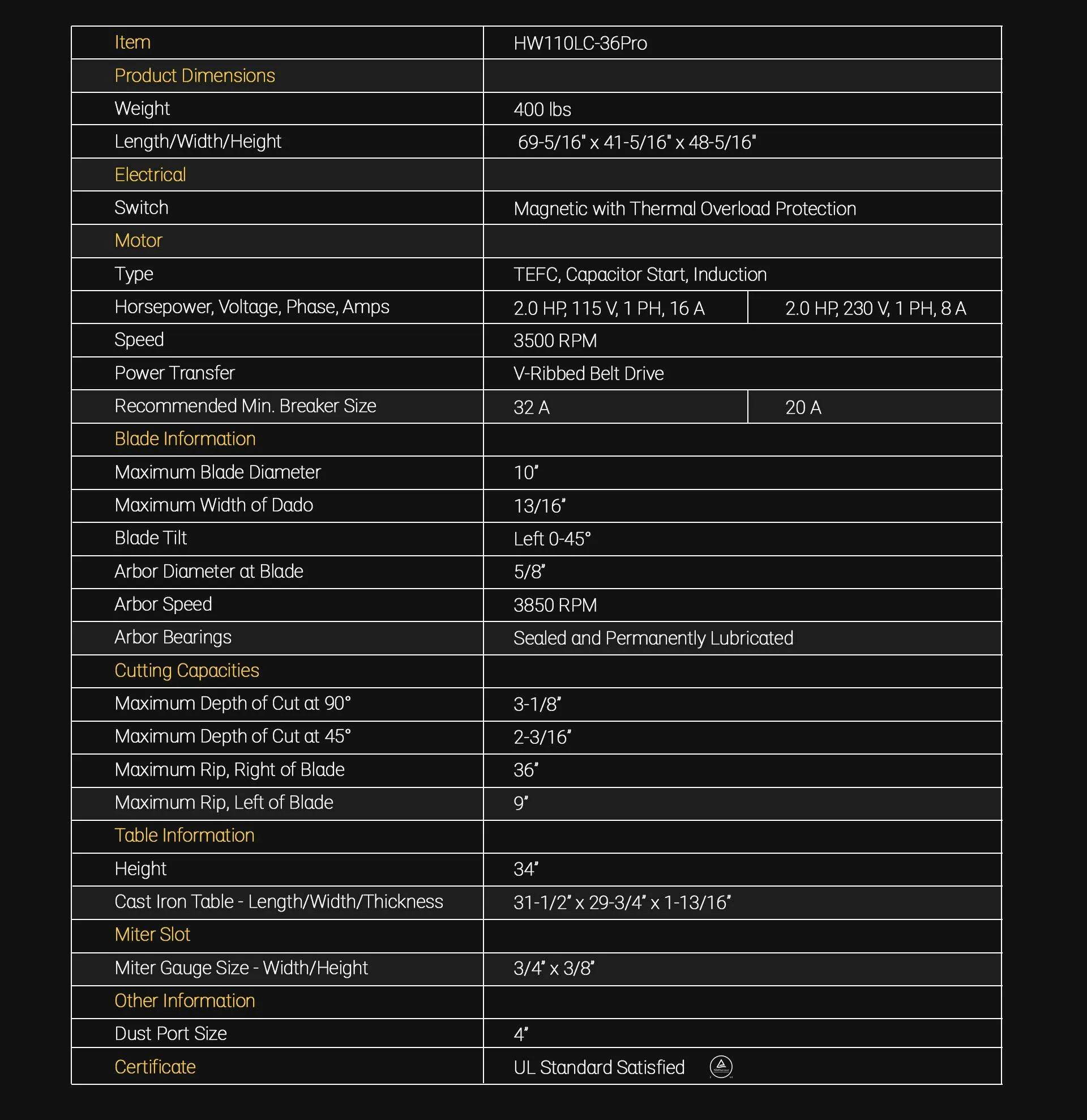 The HW110LC-36Pro series cabinet saws are a testament to performance and safety, incorporating all the exceptional features you have come to appreciate and love in the prior HW110LC-36 series.