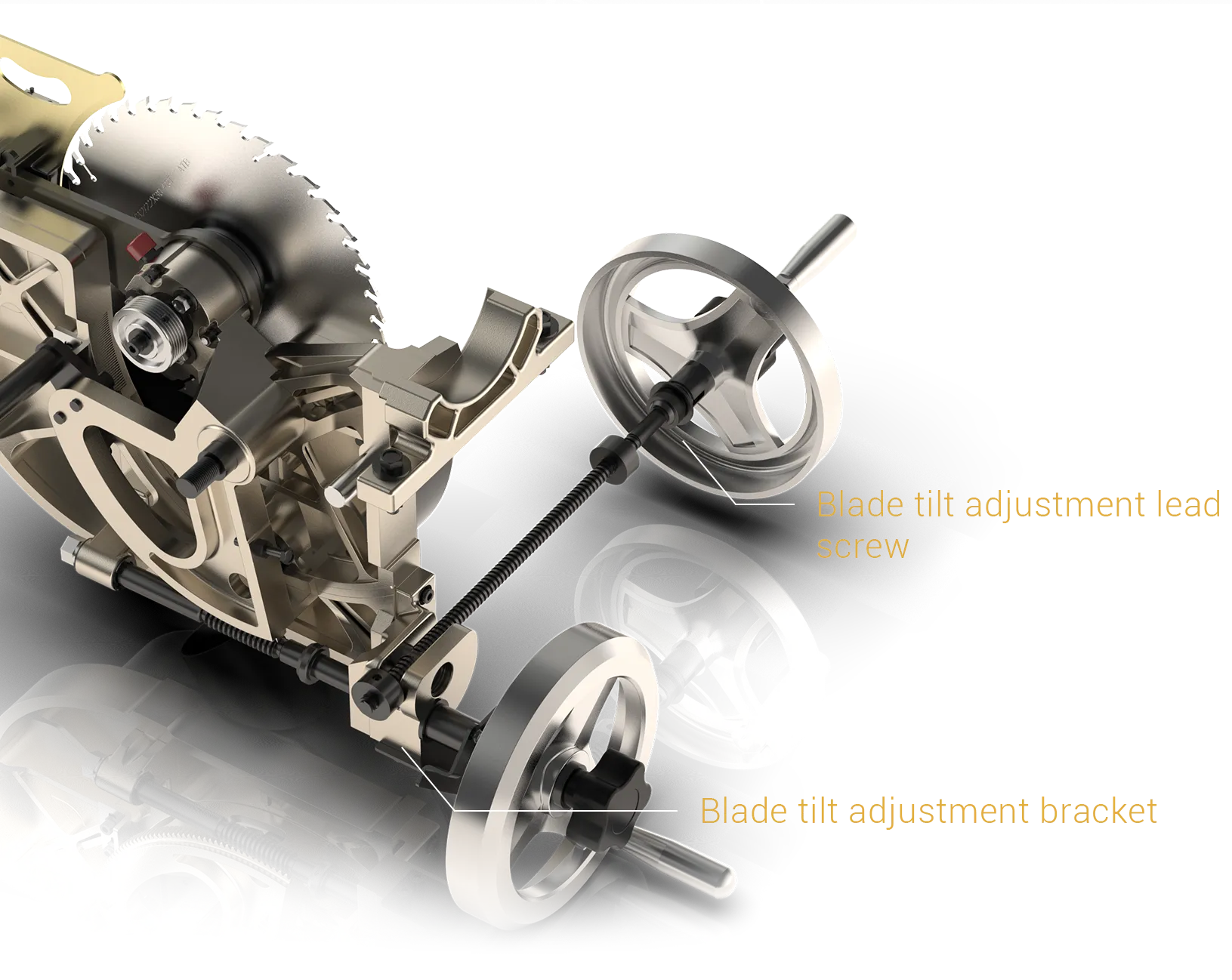 The blade tilting is controlled by the lead screw mechanism. The blade is tilted by the whole blade elevating assembly being moved with a lead screw.