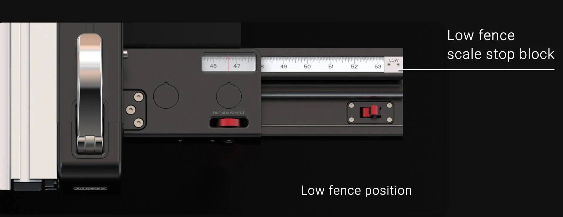 The Big Eye Rip Fence System includes versatile high/low fence plates to accommodate different wood thicknesses. The high fence is designed for cutting thick wood, while the low fence is suitable for thin wood. Switching between positions is effortless with the sliding scale system.