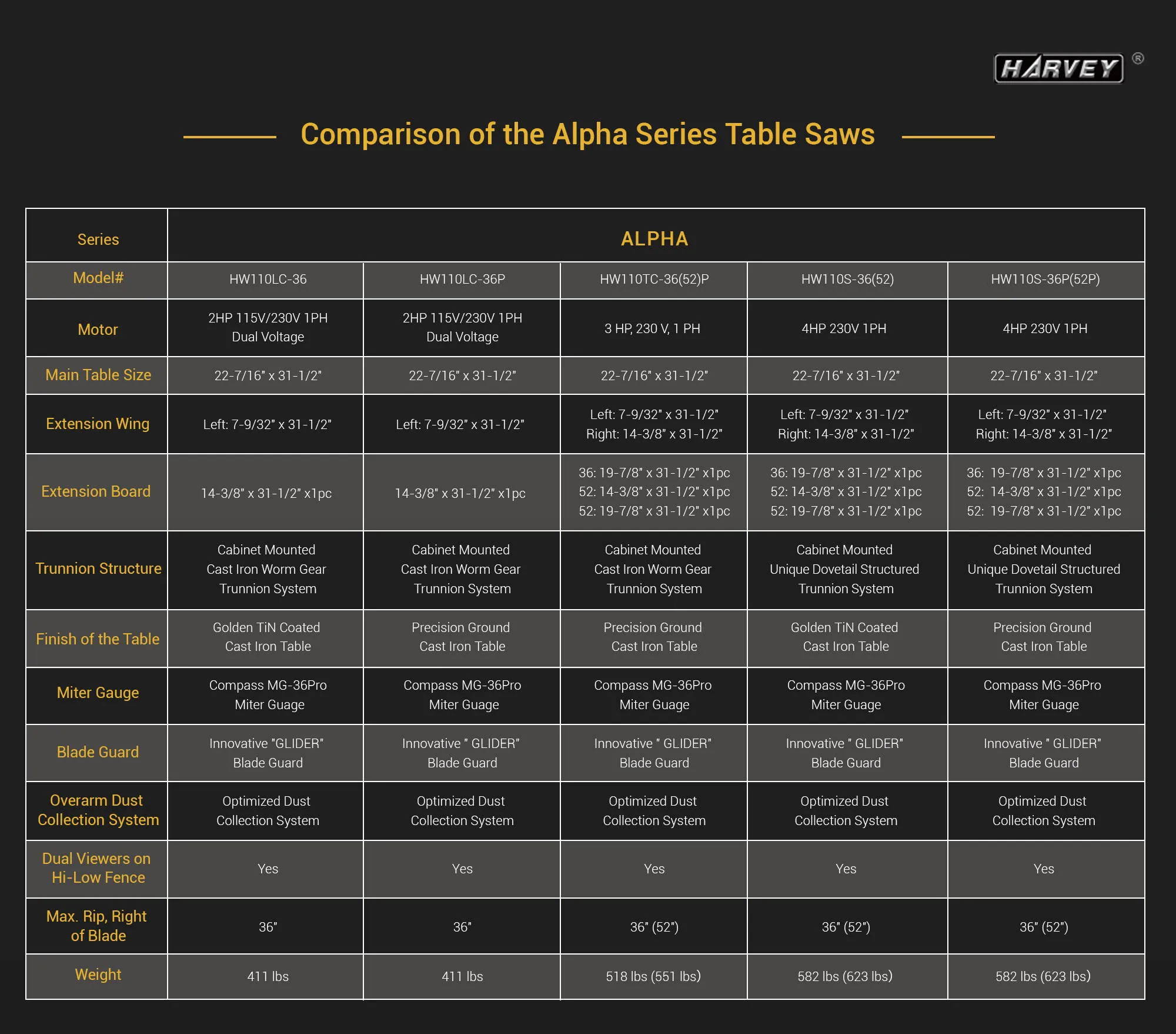 Crafted to the highest standards of quality, the ALPHA Series HW110LC-36Pro Stain-less Cabinet Saws are not merely tools but an investment in your craft. Whether you are a seasoned professional or setting up your first woodworking shop, these saws offer the reliability and performance necessary to elevate your woodworking projects to new heights.