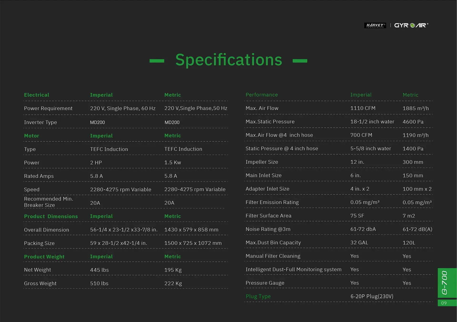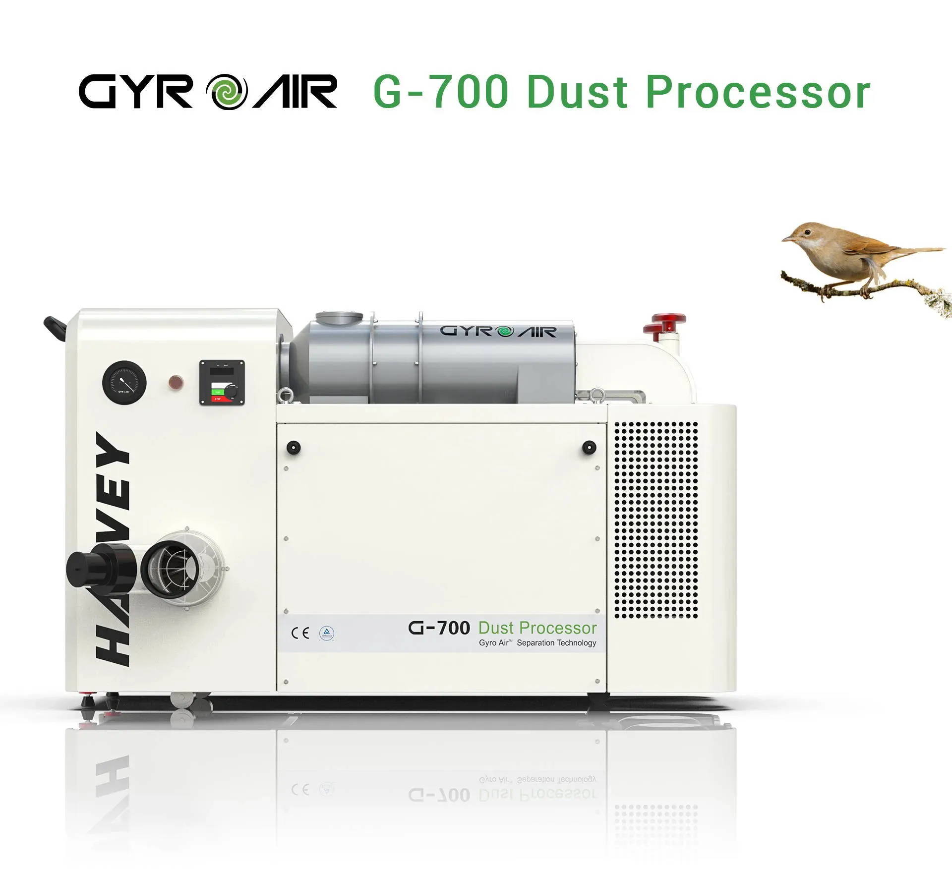 To solve this problem, Harvey team of engineers spent over 7 years of research and study, to develop an unprecedented Dust Collector, the Gyro Air® G-700 Wood Dust Processor. The G-700 Gyro Air® Wood Dust Processor incorporates a unique, patented technology to separate dust particles from the air and capture them before they enter the filters.
