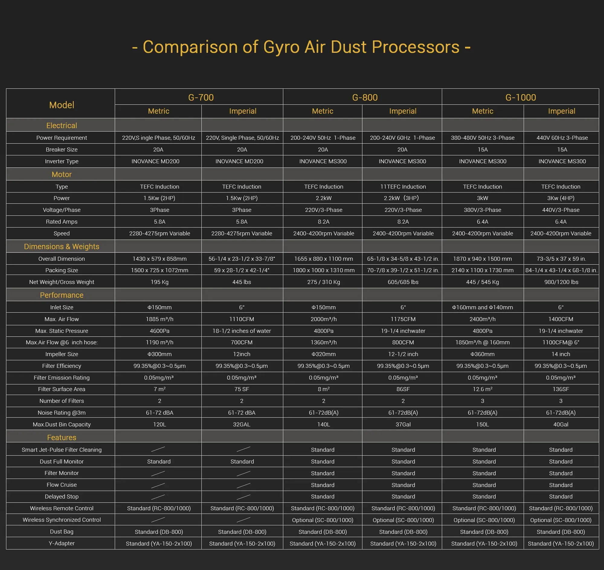 over 7 years of research and study, to develop an unprecedented Dust Collector, the Gyro Air® G-700 Wood Dust Processor. The G-700 Gyro Air® Wood Dust Processor incorporates a unique, patented technology to separate dust particles from the air and capture them before they enter the filters.The G-700 uses the new Axial Centrifugation Technology (called Gyro Air® Technology), to spin the air/dust stream up to 4,000 RPM and generate a super strong centrifugal force (over 100 times gravity) to separate the dust from the air and collect it in two dust bins hidden internally in the unit.