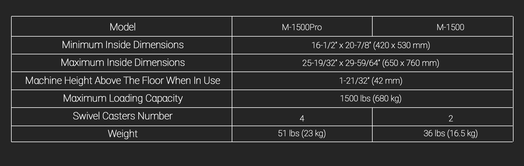 Constructed with high-quality aluminum alloy and stainless steel, the M-1500 (Pro) boasts excellent rust and wear resistance, efficiently bearing loads up to 1500 lbs (680 kg).