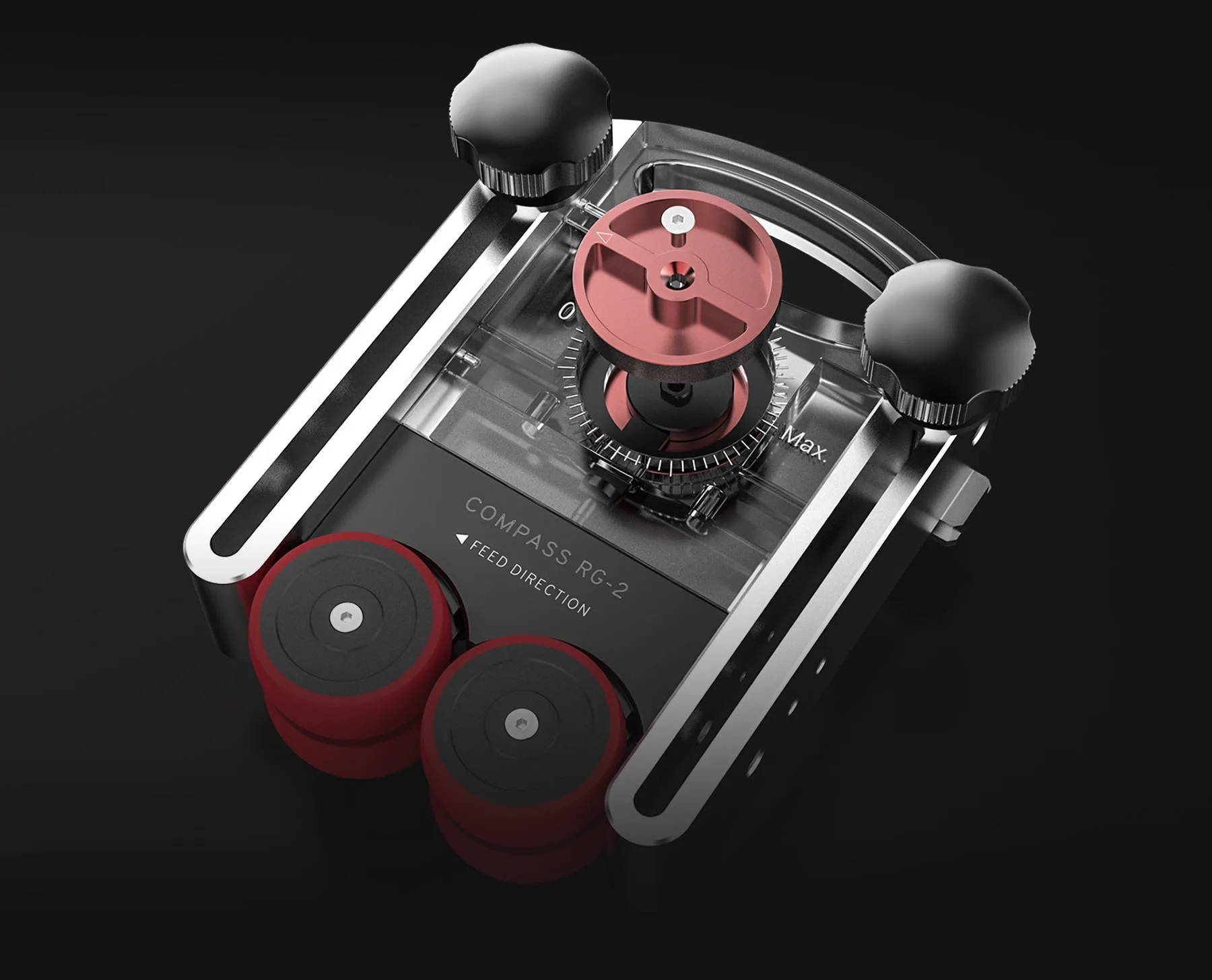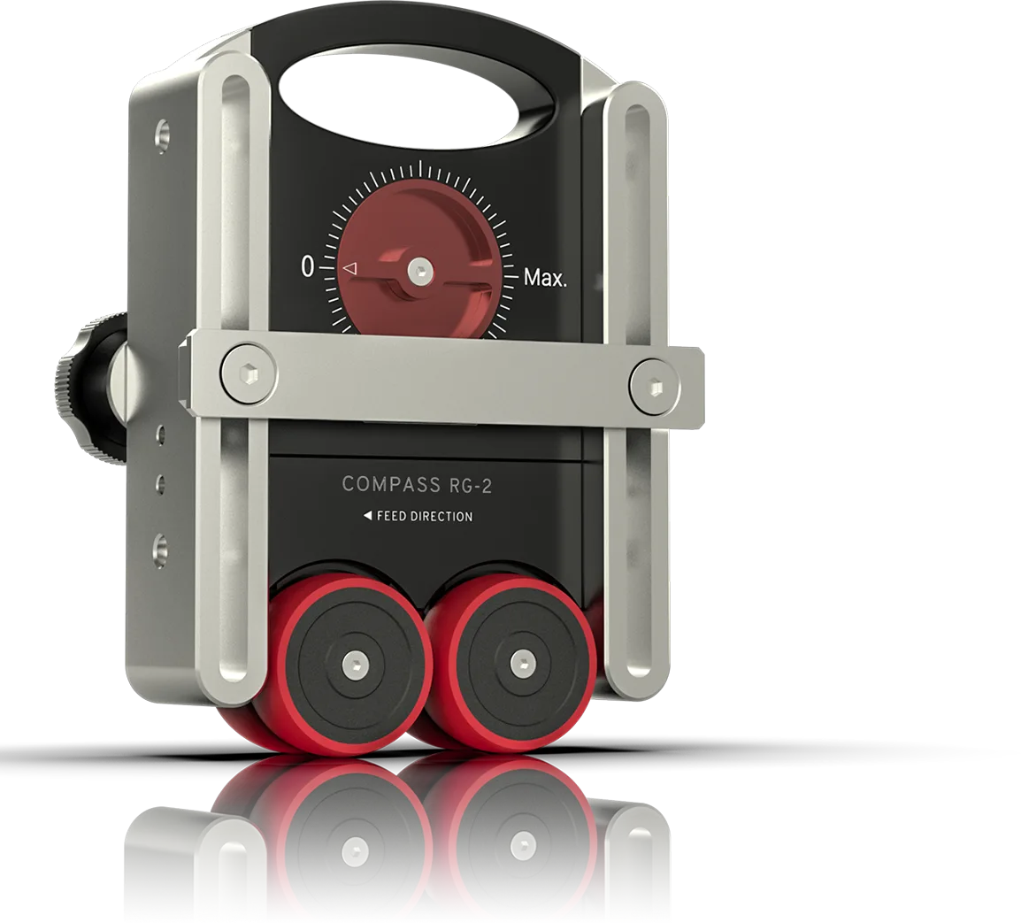 The Compass Universal Roller Guide features a unique ‘Independent Suspension Mechanism’ -- each roller is fitted with a pre-loaded spring independently, which allows the two guide rollers to move independently to adapt the dynamic stock surface with even holding pressure.