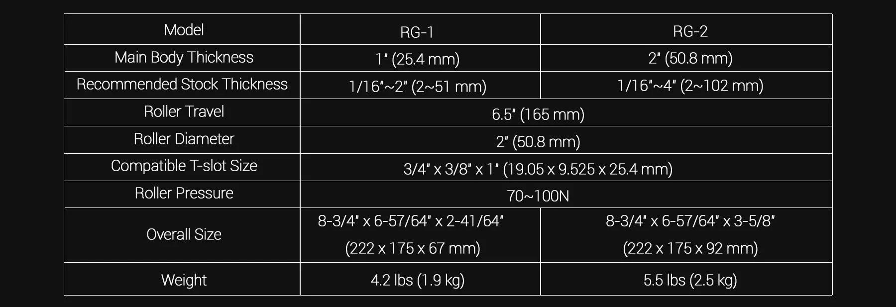 The Universal Roller Guide has two versions (RG-1 & RG-2) with different thickness (1" & 2") available for using on thin or thick stock. For RG-1, the recommended stock thickness range is 1/16"~2"; for RG-2 the thickness range is 1/16"~4".